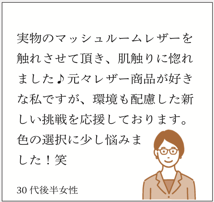 マッシュルームレザーの個性的な柄を通して人々が持つ多様性や個性を尊重していきたいと思っています。そんな思いも一緒に受け取っていただけたら嬉しいです。