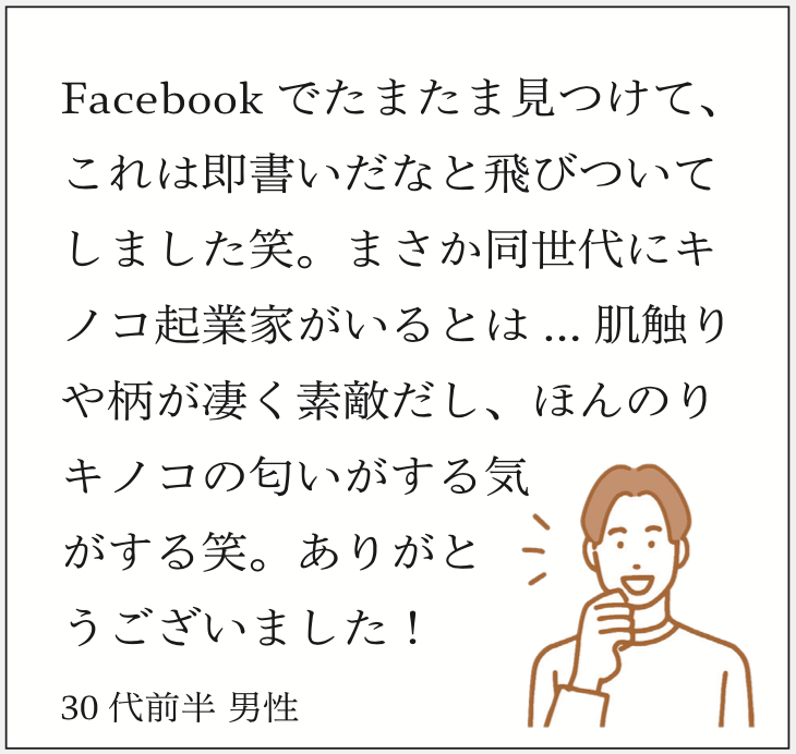 クラファン購入者向けに実施したアンケートでは、多くの方々から高評価をいただき、製品の品質と理念に共感頂きました。