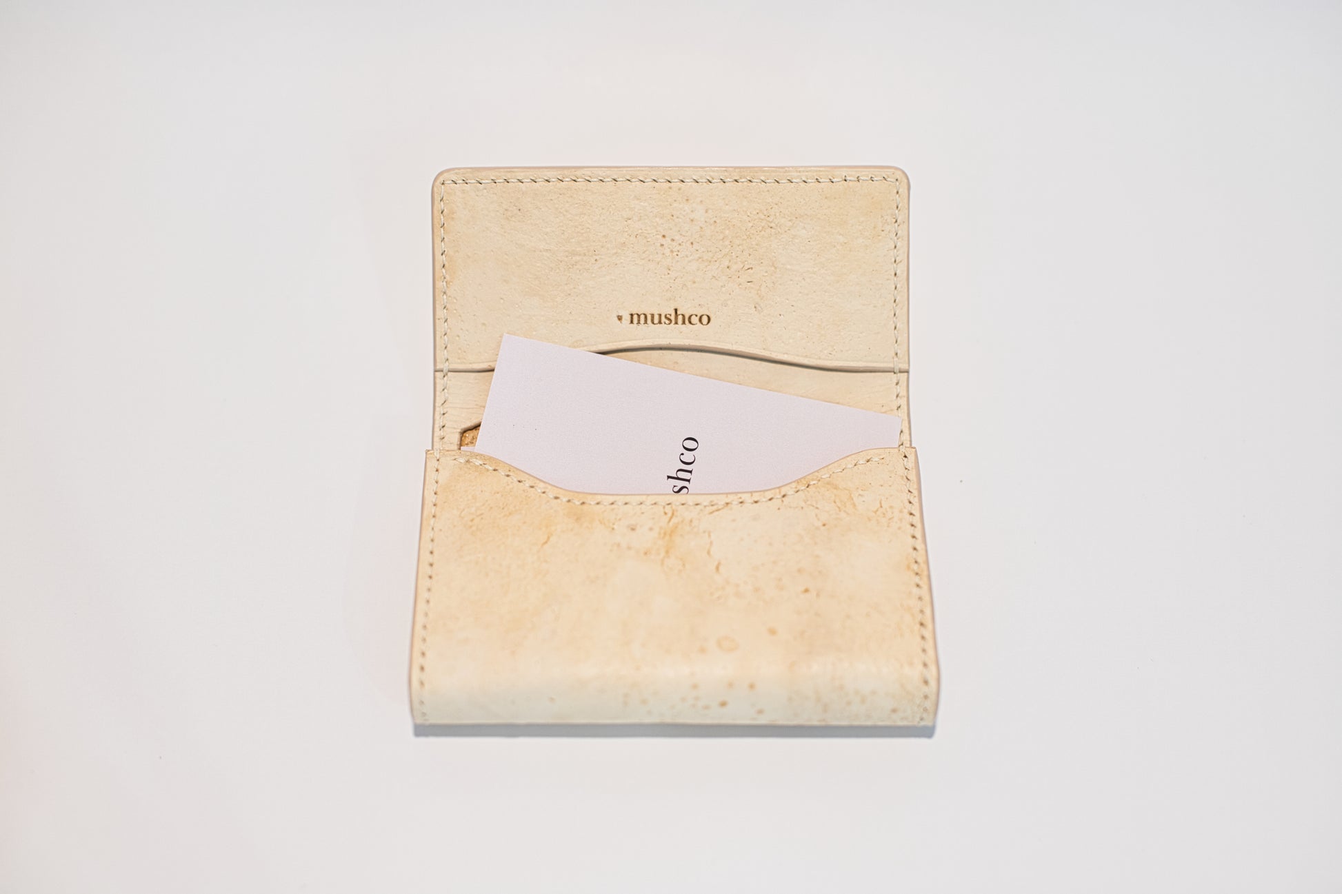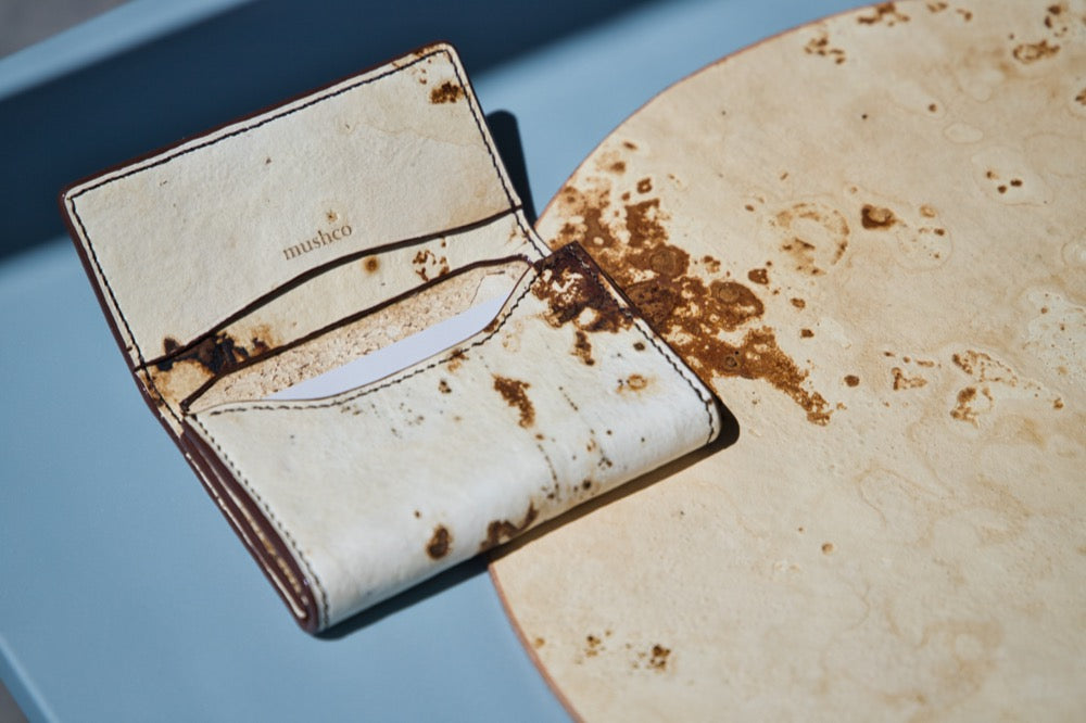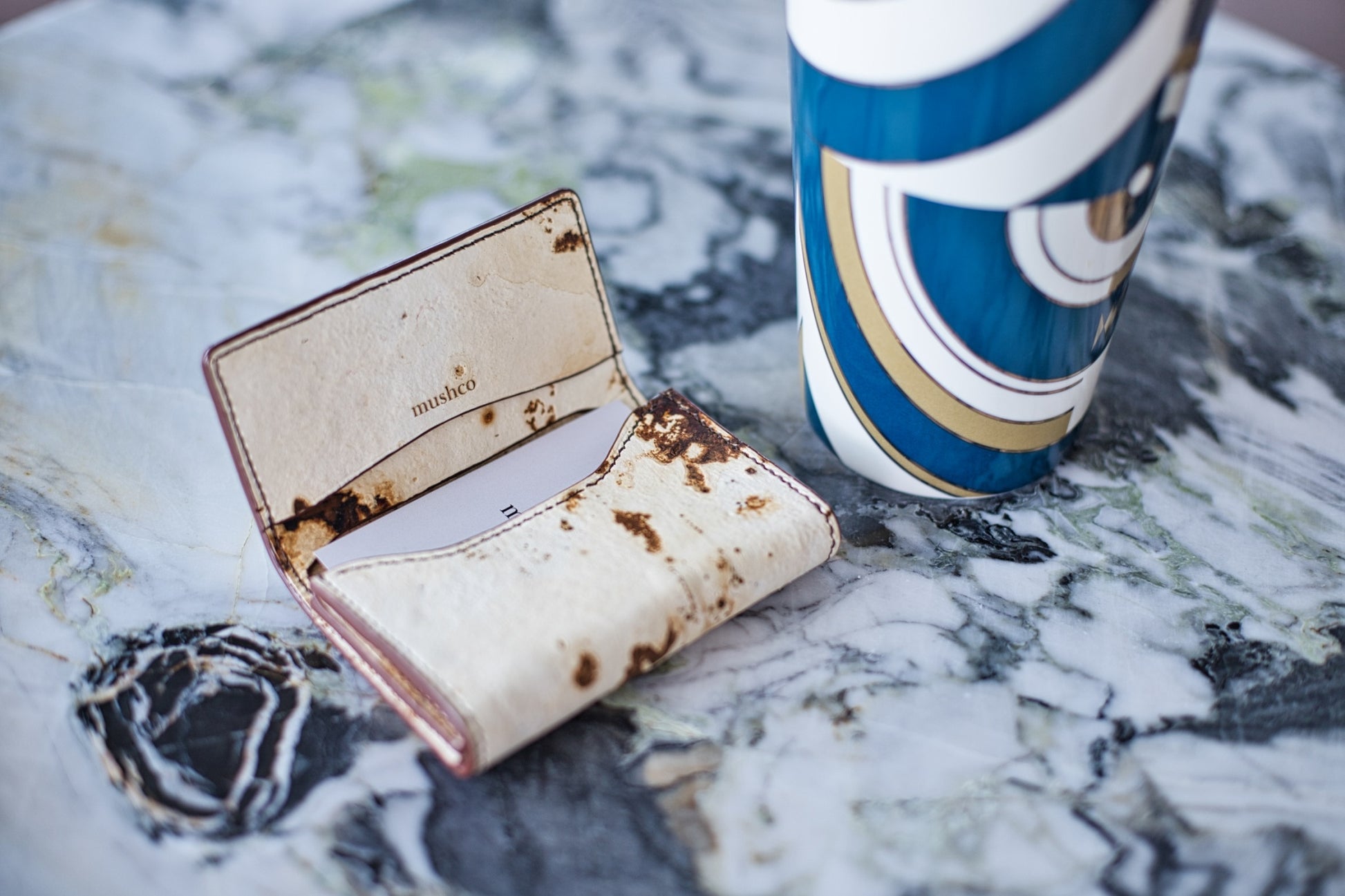 キノコの菌糸体由来のサステナブル皮新素材「マッシュルームレザー」を使用したデザイン性と機能性を兼ね備えた最高級のサステナブル名刺入れ。